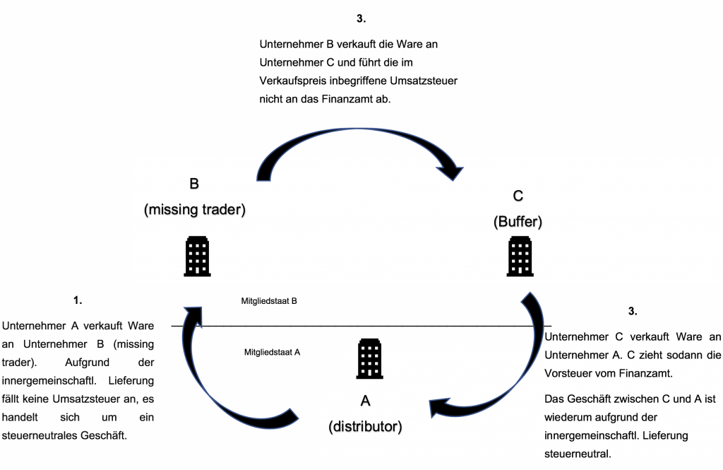 Unternehmer A mit Sitz in einem EU-Mitgliedsstaat (der sogenannte distributor) verkauft grenzüberschreitend Waren an Unternehmer B in einem anderen EU-Mitgliedsstaat (der sogenannte missing trader). Häufig handelt es sich hierbei um kleines, aber teures Gut wie etwa Computerchips, Smartphones oder auch CO2-Zertifikate. Aufgrund der beschriebenen innergemeinschaftlichen Lieferung ist dieses Geschäft für beide zunächst steuerneutral.